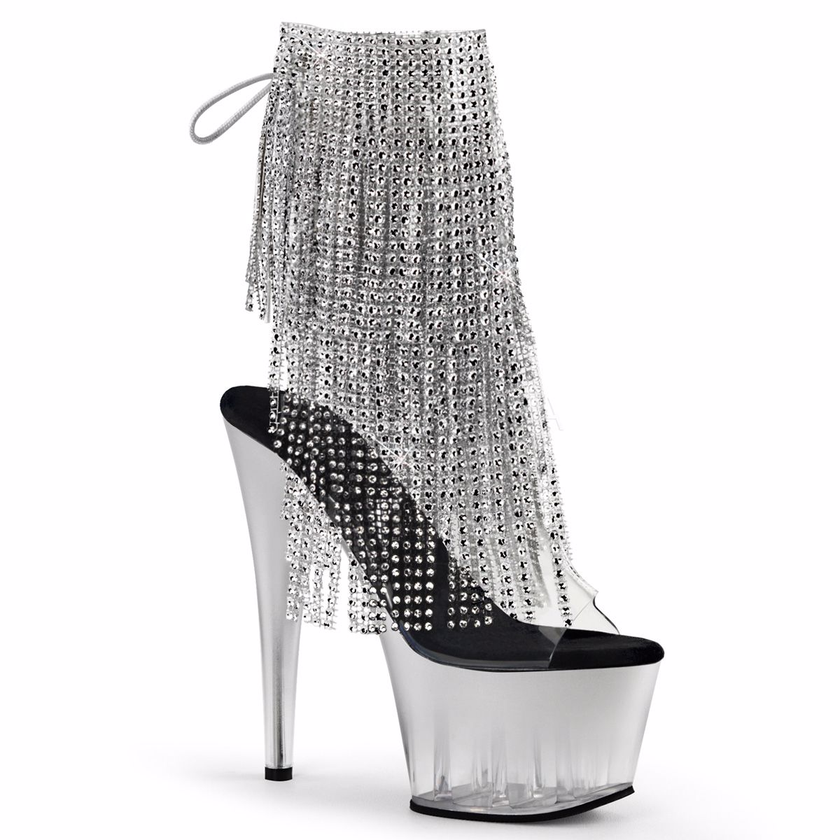 7 inch (17.8 cm) Stiletto Heel, 2 3/4 inch (7 cm) Platform Open Toe/Stiletto Heel Back Lace-Up Ankle Boot Featuring 4-Layer Chrome Plated, Simulated Rhinestone Fringe, Inside Zip Closure