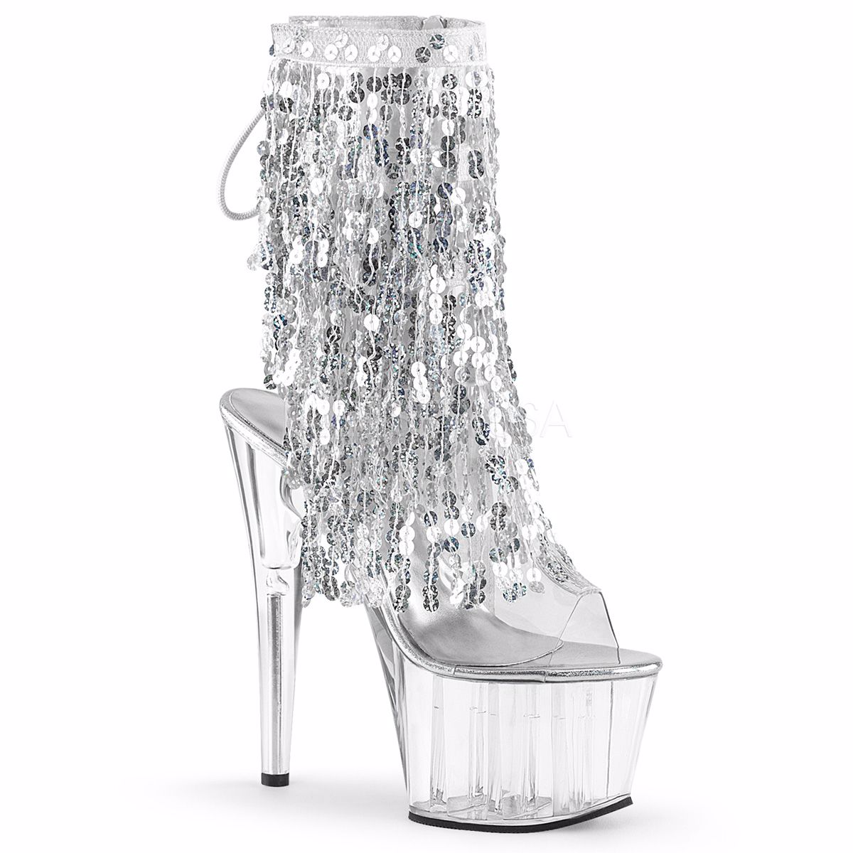 7 inch (17.8 cm) Stiletto Heel, 2 3/4 inch (7 cm) Platform Open Toe/Stiletto Heel Lace-Up Back Ankle Boot Featuring 4-Layer Sequins Fringe, Inside Zip Closure