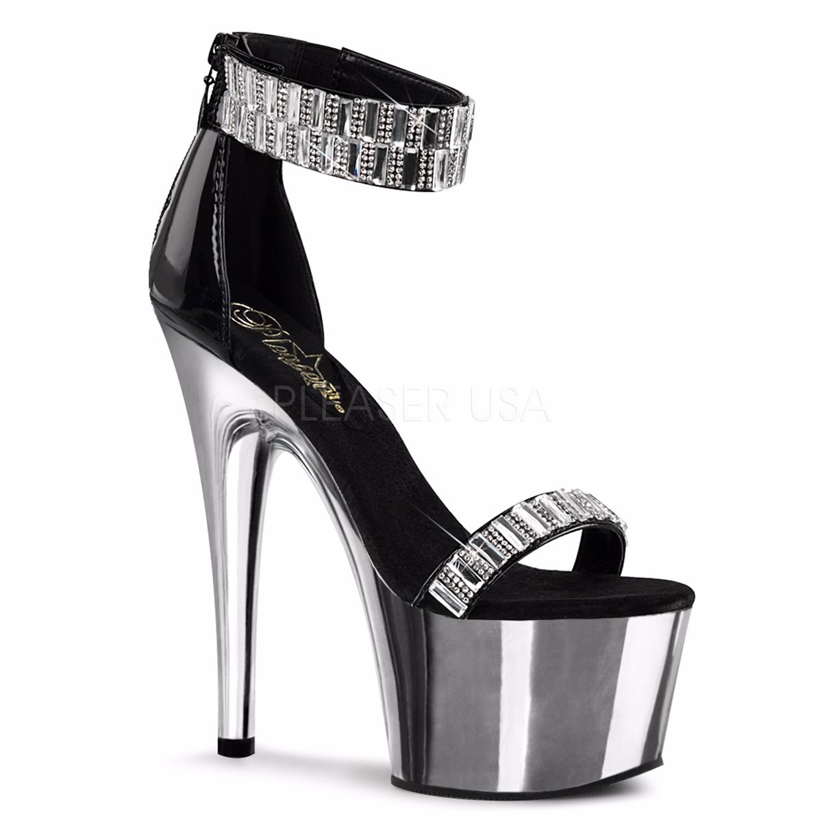 7 inch (17.8 cm) Stiletto Heel, 2 3/4 inch (7 cm) Chrome Plated Platform Closed Back Sandal Featuring Rhinestone and Mirrors Embellished All Over Ankle Cuff & Toe Strap, Back Zip Closure