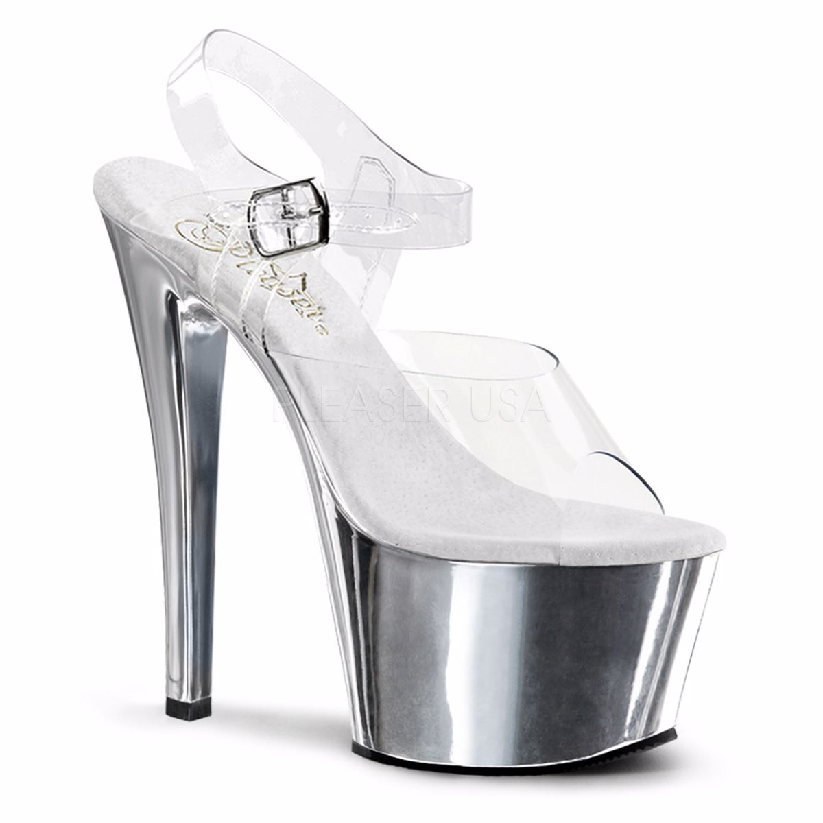 7 inch (17.8 cm) Heel, 2 3/4 inch (7 cm) Platform Ankle Strap Sandal with Chrome Plated Bottom